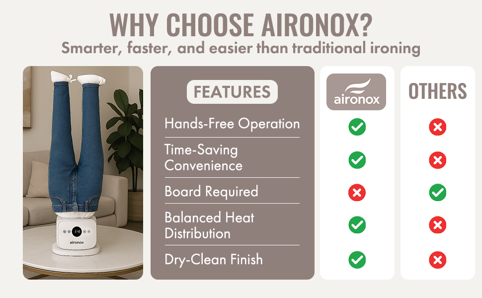 Compact, easy to use, and worldwide compatible with a UK plug and universal adapter, Aironox keeps your clothes looking crisp wherever you go. 👔✨